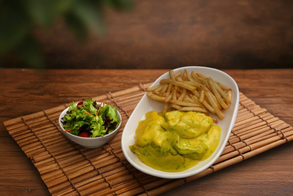 Tavuk göğüs, özel Cafe’de Paris sos, baharatlı patates kızartması ve körpe Akdeniz yeşillikleri
