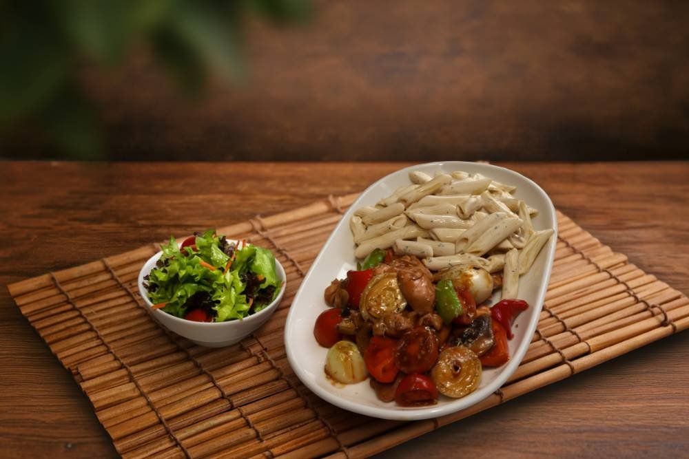 Tavuk but, chery domates, renkli biber, arpacık soğan, köy mantarı, dağ kekiği, özel krema soslu makarna, körpe Akdeniz yeşillikleri