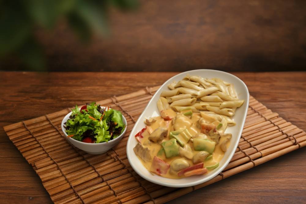 Tavuk but, renkli biberler, peri peri sos, özel krema soslu makarna, körpe Akdeniz yeşillikleri