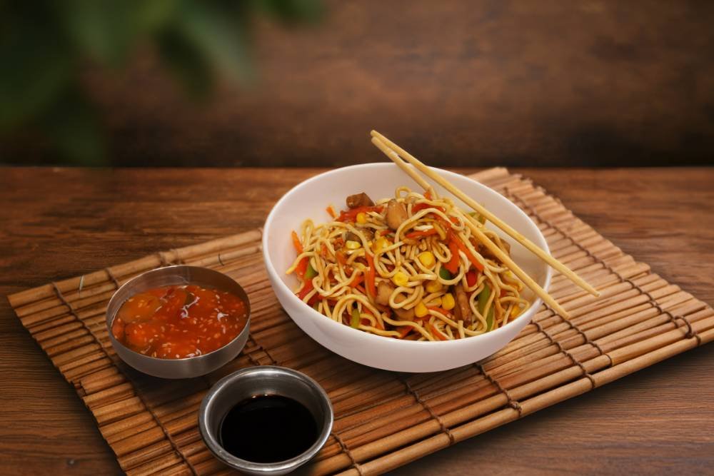 Jülyen sebzeler, renkli biberler, mantar, susam ve uzak doğu sosları ile