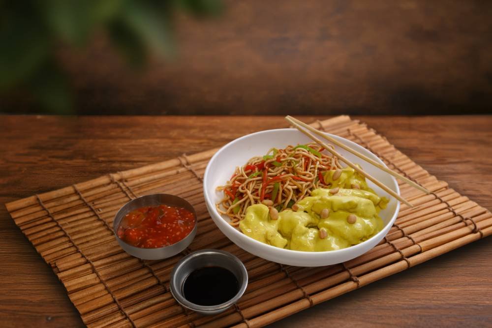 Köri soslu, sebzeli Asya usulü paneli tavuk göğüs, yer fıstığı ve sebzeli noodle ile